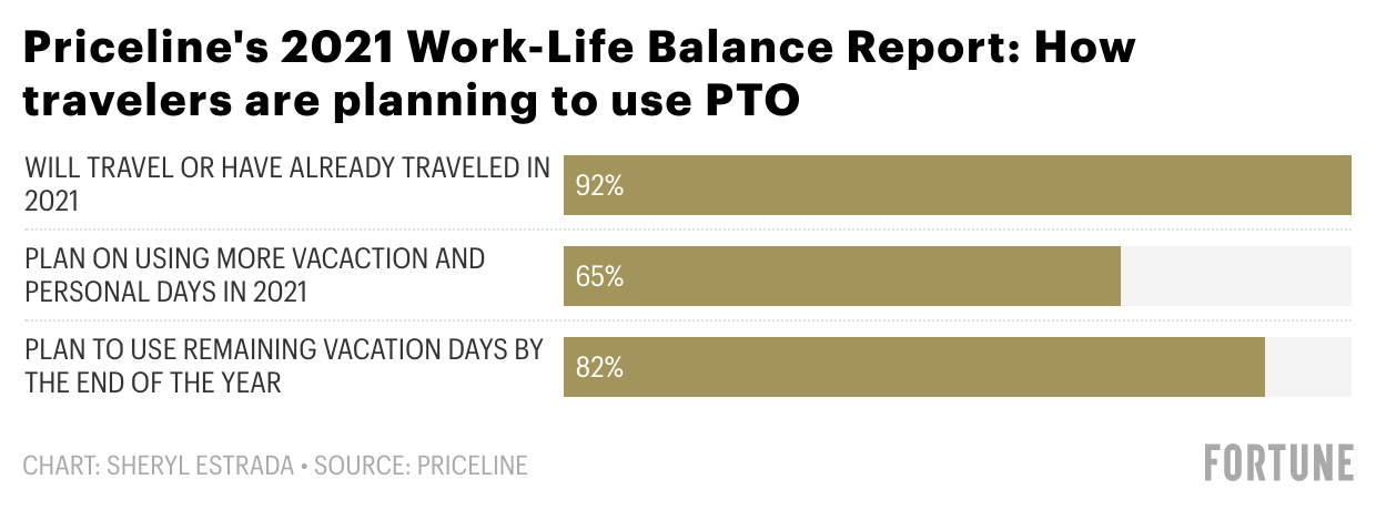 Priceline's 2021Work-Life Balance Report takes a look at how travelers are using PTO based on a survey of 1,000 full- or part-time employees in the U.S. The majority of respondents (92%) said they will travel, or already have, in 2021. Last year, only 21% of Americans used all of their PTO, down from 30% in 2019, according to the report. But that may change this year. More than half (65%) of respondents plan on using their vacation and personal days.