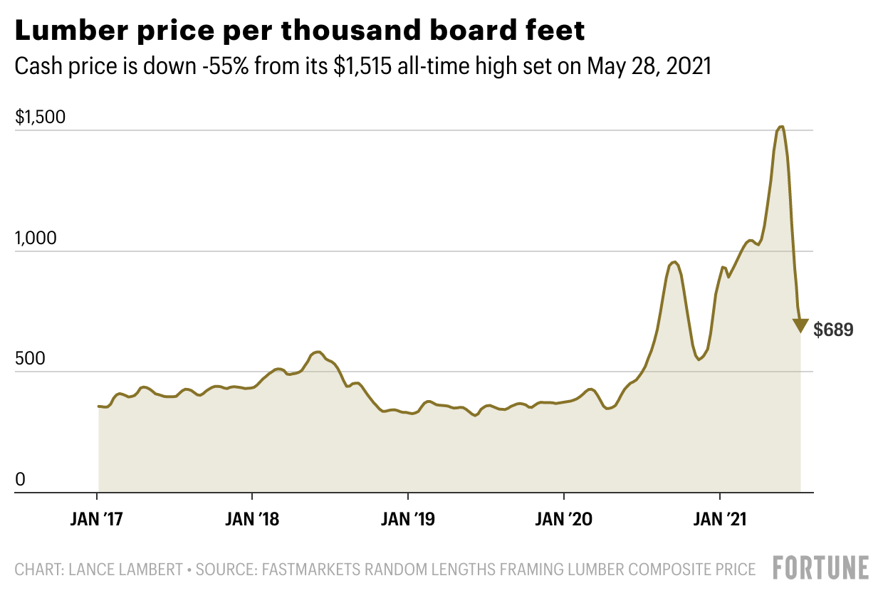That descent continued last week, as it notched its sixth consecutive week of decline. On Friday, the “cash” price of lumber fell $81, to $689 per thousand board feet, according to industry trade publication Fastmarkets Random Lengths. That’s a 55% drop from its $1,515 all-time high set on May 28.