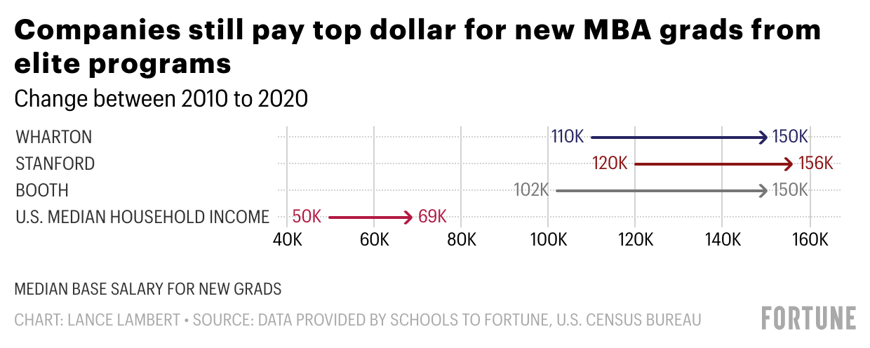 Despite eager venture capitalists and no shortage of thought pieces claiming the MBA is dead, the upper echelons of B-schools are looking pretty safe. Simply put, companies are still hungry for what top programs are producing. If dollars are any indication, demand for MBA graduates from elite programs is as strong as ever. That’s what Fortune found after collecting data for our first-ever Best MBA Programs list. In 2010, new MBA graduates at Wharton (No. 3 on our list) earned a median $110,000 base salary right out of the gate. Ten years later, that median is up 36% to $150,000. Wharton isn’t unique in that regard: During the same period, median base salaries rose 30% at No. 2 ranked Stanford and 47% at No. 4 ranked University of Chicago’s Booth School of Business to $156,000 and $150,000, respectively.