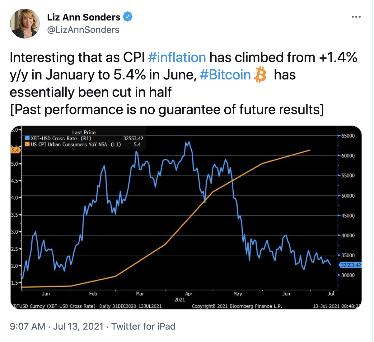 Side note: Crypto as an inflation hedge? To be sure, the comparisons aren’t perfect, but take a look at this chart tweeted by Charles Schwab’s Liz Ann Sonders on rising inflation and the performance of Bitcoin.