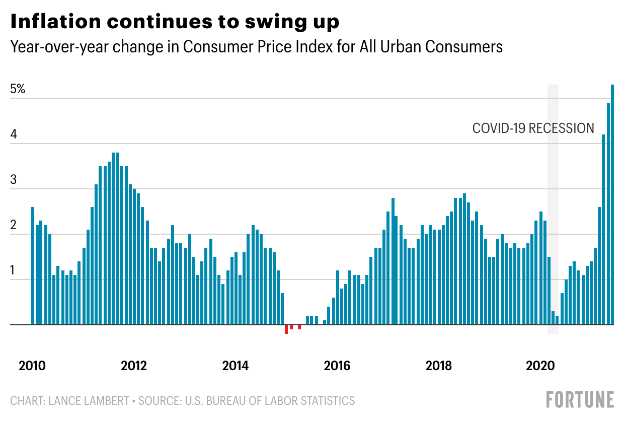 The CPI, or consumer price index, rose 5.4% in June from a year ago, marking the biggest jump since 2008, while core CPI (which excludes food and energy) leaped the most since the early 1990s, at 4.5%.