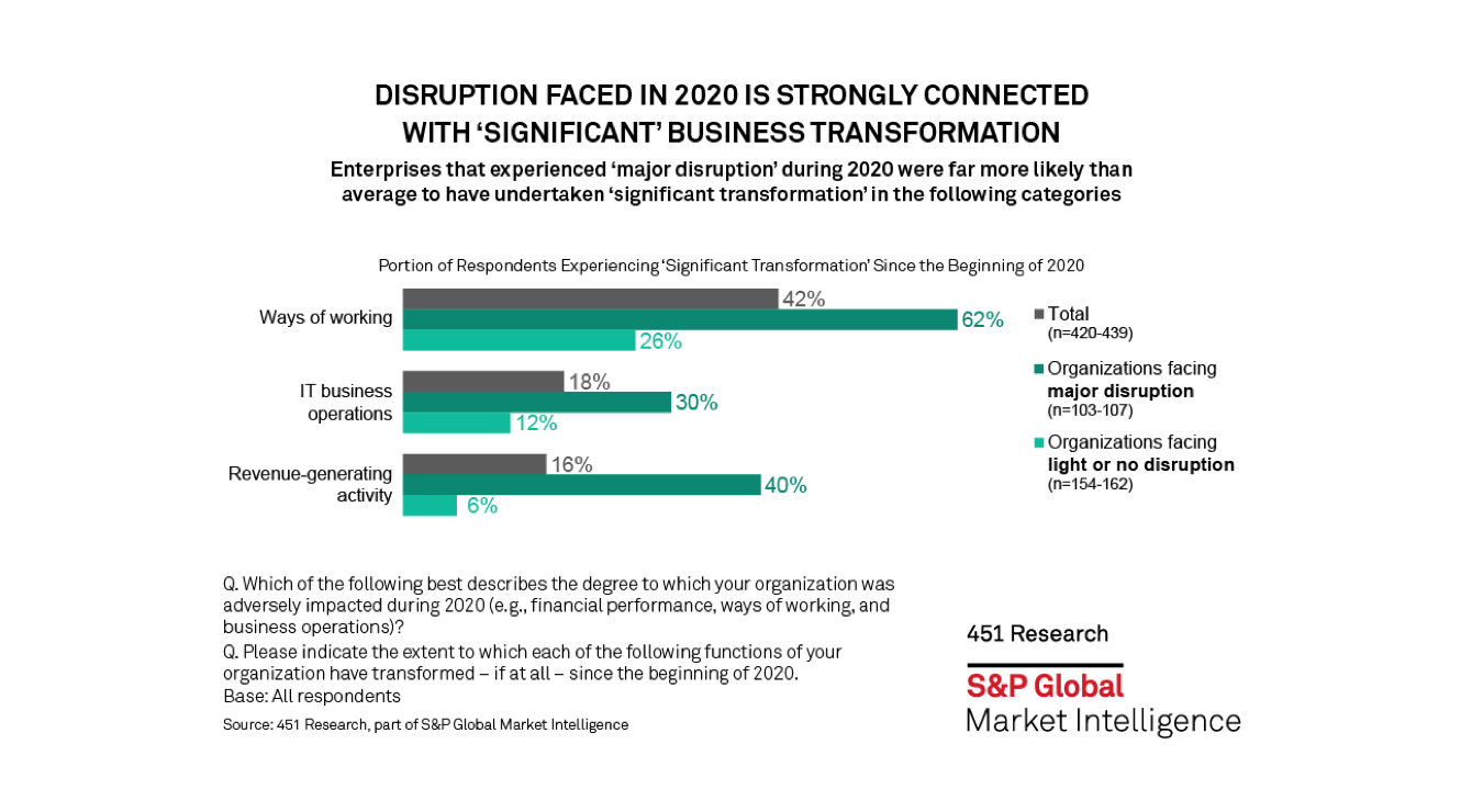 A new survey from S&P Global Market Intelligence took the pulse of roughly 500 key IT decision makers across a range of industries, and found that an overwhelming majority (90%) were either “somewhat or very optimistic” about their companies’ prospects in 2021. But that optimism comes in the wake of an exceptionally challenging 2020, as nearly two-thirds (63%) of respondents said their businesses faced either “moderate or major disruption” as a result of the pandemic—with a quarter, or 25%, falling into the “major disruption” category. The survey also documented “widespread reinvention in how many of these businesses will operate going forward,” with 76% reporting that their organizations have experienced “moderate to significant transformation in ways of working” since the beginning of 2020.