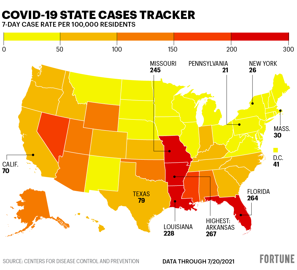 As was the case in the United Kingdom and now Continental Europe, the Delta variant is the new dominant strain in the U.S., accounting for 83% of all new infections. It’s hitting low-vax states particularly hard.