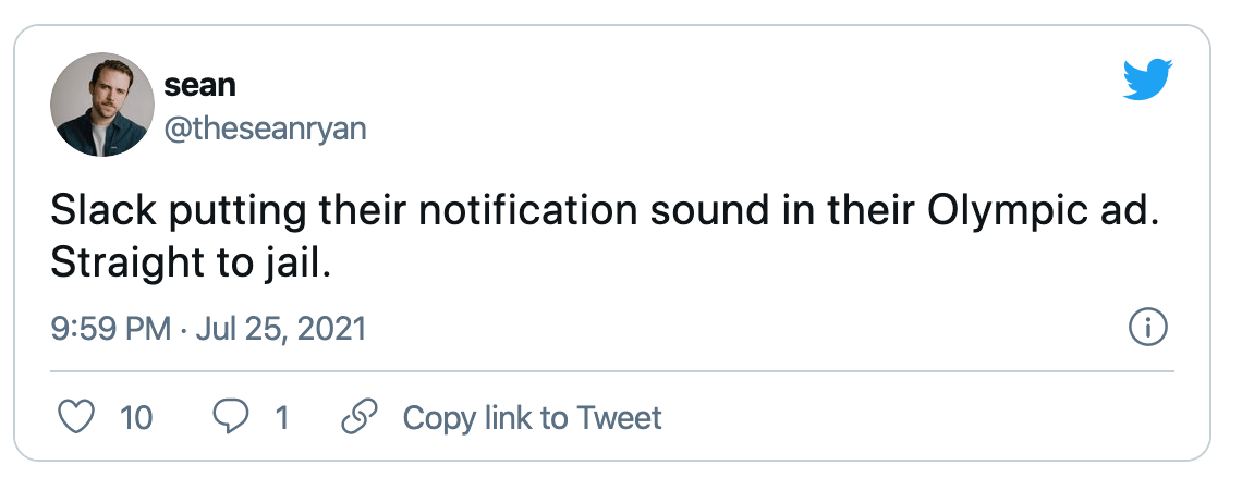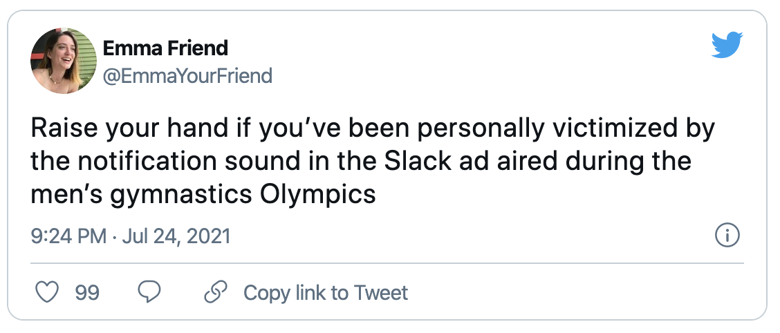 A reminder that you will never escape work notifications.Workplace chatting app Slack, now owned by Salesforce, debuted a television commercial for the Olympics that begins with the clicking sound that notifies people that a colleague is messaging them. As numerous people said via Twitter, that notification sound can instantaneously cause people to think about work instead of the Olympic games. One Twitter commenter noted that “Just hearing the notification sound gave me a wee adrenaline spike,” while another said “Raise your hand if you’ve been personally victimized by the notification sound in the Slack ad aired during the men’s gymnastics Olympics.”