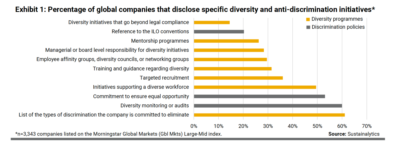 Many companies are doing the minimum. For example, just 15% of firms sampled from this index go beyond legal compliance needs for diversity initiatives, according to the report. Less than 30% have managerial or board-level responsibility for diversity initiatives. And just under half of the firms have initiatives to support a diverse workforce.
