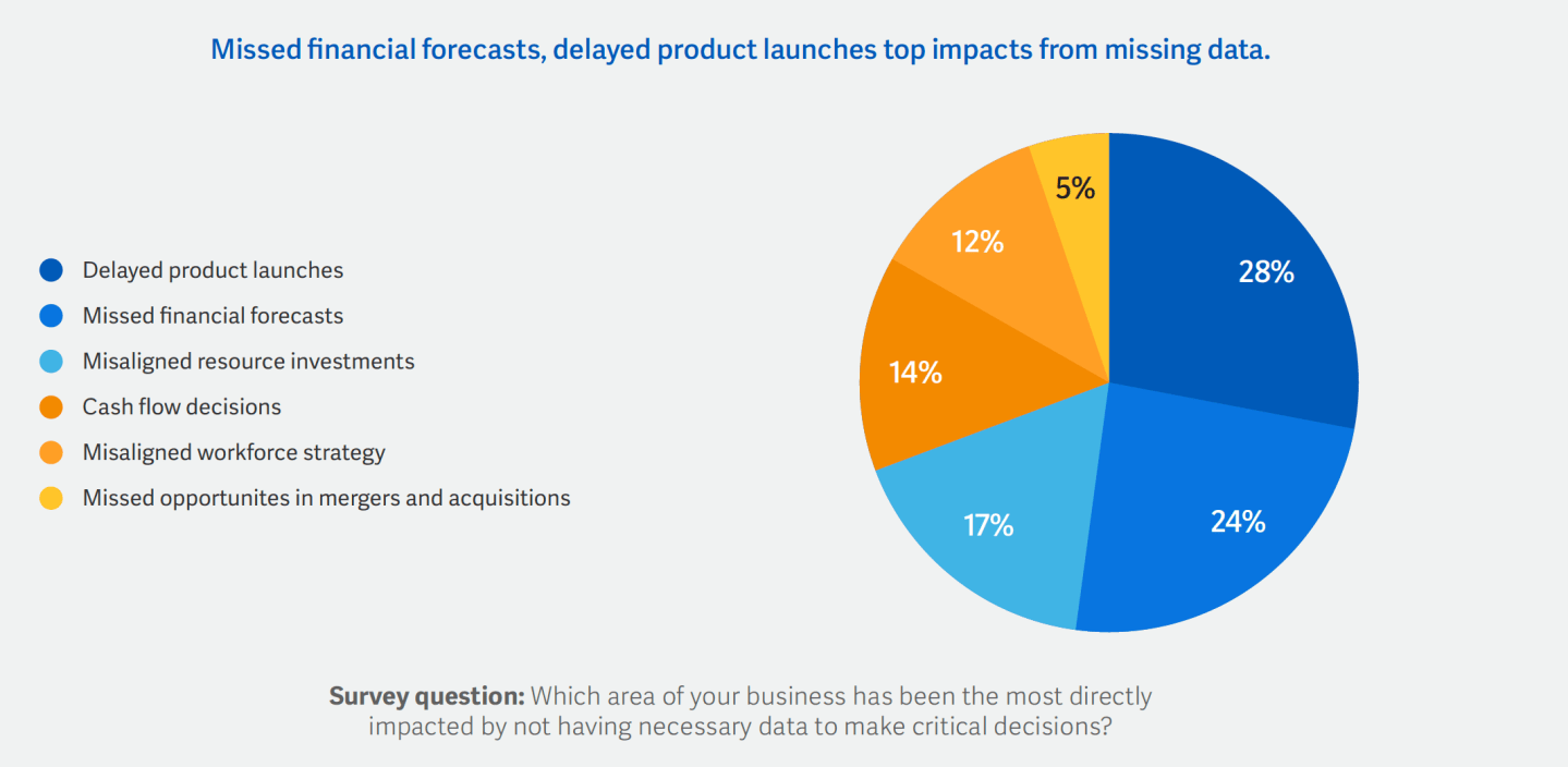 Gaps in data ultimately affected performance. About 28% said the lack of data impacted critical business decisions in product launches. Meanwhile, 24% cited missed financial forecasts, and 17% pointed to misaligned resource investments.