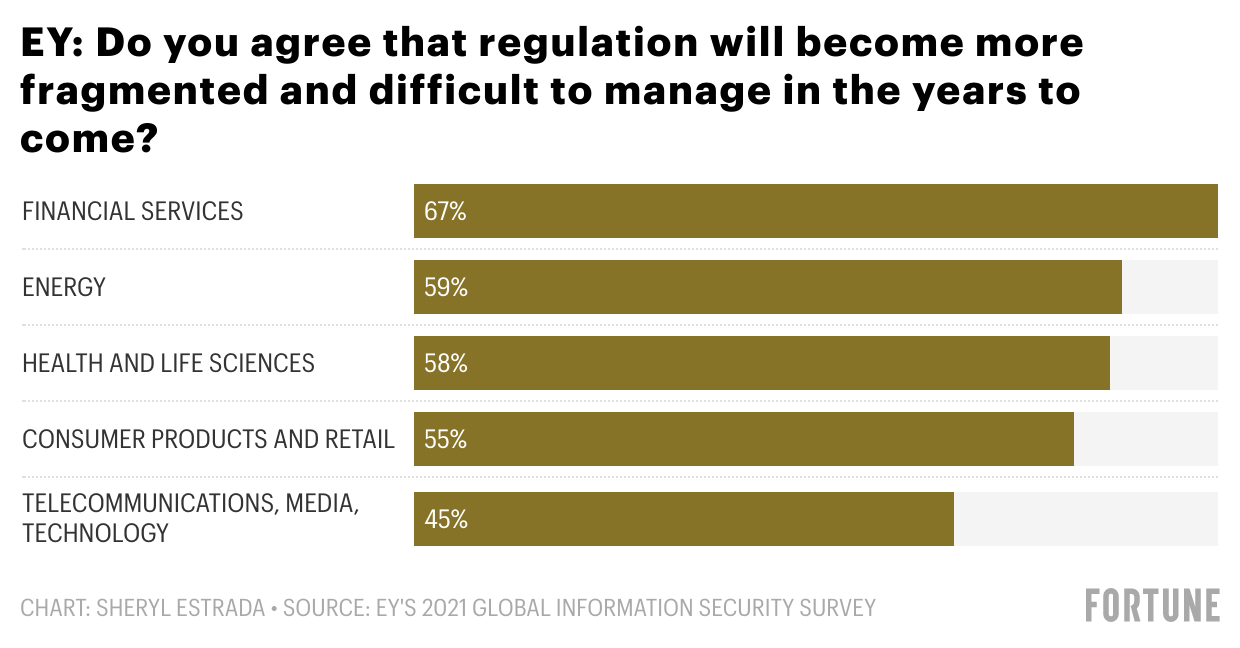 The global compliance environment for cybersecurity is becoming increasingly complex, according to EY's 2021 Global Information Security Survey (GISS). Organizations in certain sectors, especially financial services, have to manage industry-specific regulations as well. The GISS also found that 56% of respondents said businesses have "sidestepped cyber processes" to meet requirements around remote work, and 77% warn of an increase in the number of disruptive attacks. EY surveyed more than 1,000 cybersecurity leaders at organizations worldwide.