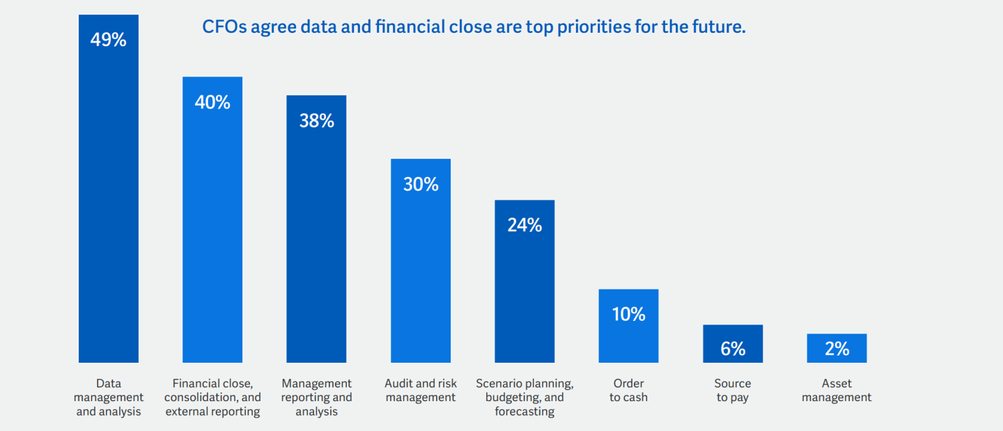 Along with data management and analysis, the second-biggest priority reported by CFOs was financial close, consolidation, and external reporting. The next step will be embracing new technologies, according to the report. The intelligent automation features of cloud financial technology CFOs intend to invest in include predictive analysis (49%), machine learning (45%), and artificial intelligence (43%).