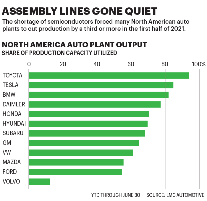 But not all carmakers have suffered equally. While rival OEMs (or original equipment manufacturers, as automakers are known) stumbled, Toyota kept production largely on target until May. The company has said factory closures owing to chip shortages would cause a shortfall of 20,000 vehicles in Japan—less than 1% of Japanese production in fiscal 2021. Toyota’s North American production, meanwhile, hummed along at 90% of capacity for the year through June. That prolonged productivity propelled the company to a rare victory: In the second quarter, it was the No. 1 automaker by sales in North America, marking the first time since 1998 that GM hasn’t held the top spot.