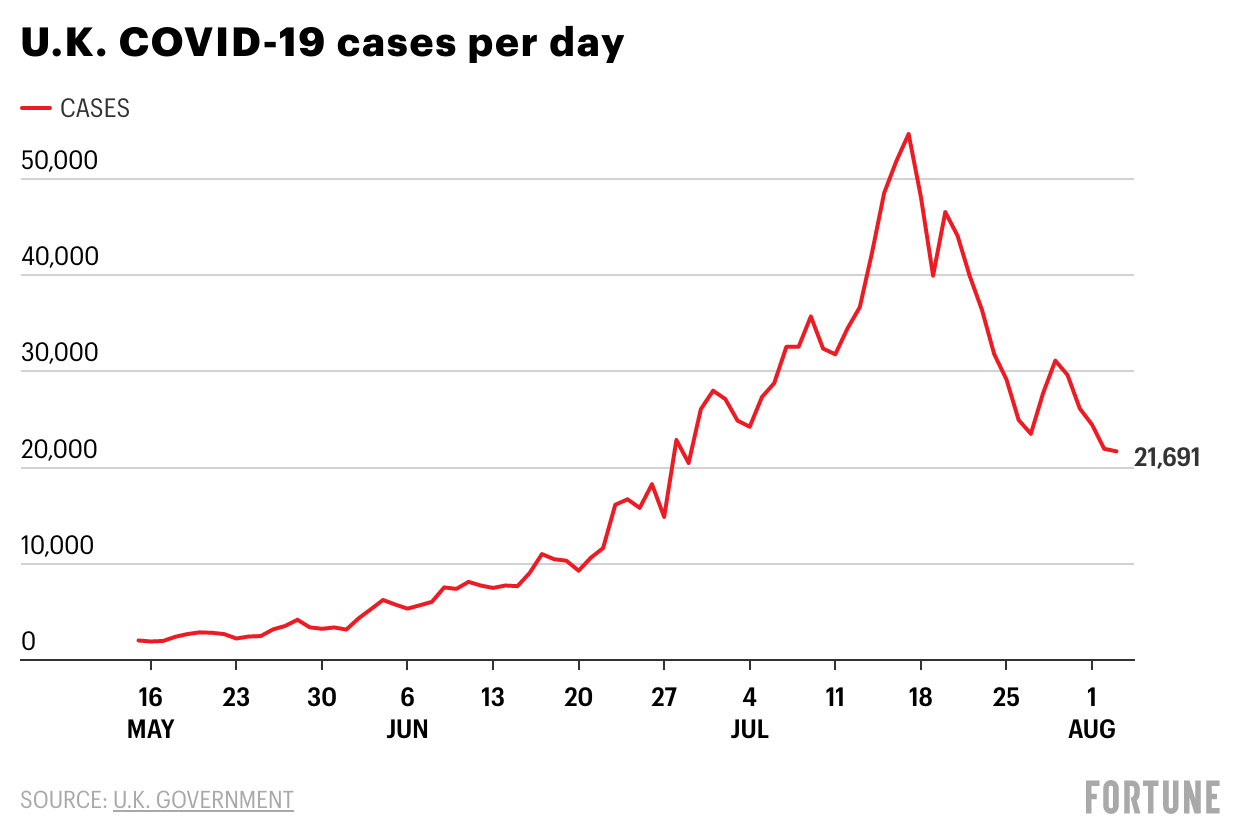 Despite warnings from scientists, the bid seems to have paid off, as the number of new reported cases peaked on July 17 at 54,674 new reported cases, and then fell steeply. By August 2, new daily cases were less than half that number, with 21,952 new cases reported, according to Public Health England.