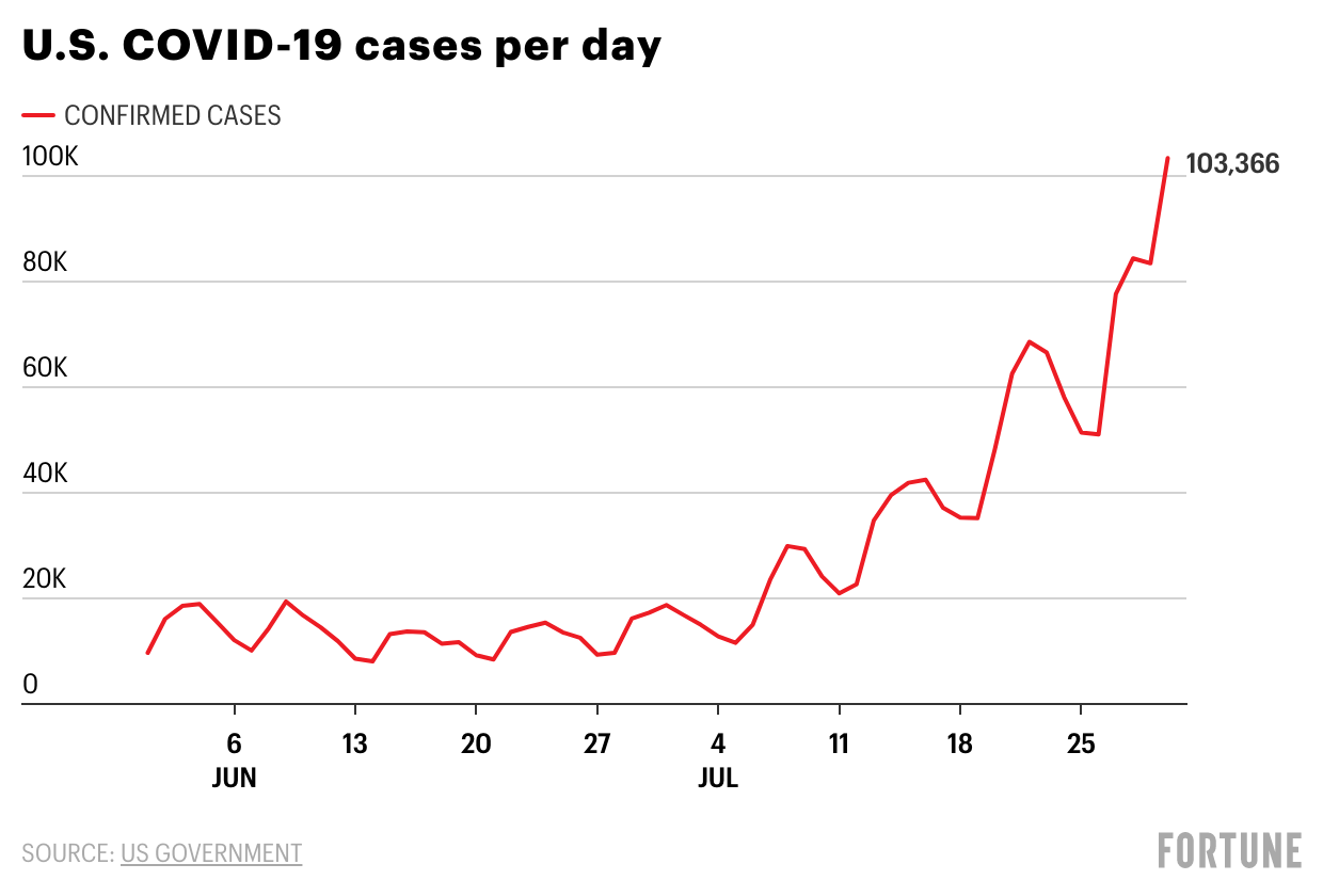 On Friday, the U.S. government reported over 103,000 new COVID-19 infections, the first time in six months that the country has topped 100,000 infections in a single day and over 10 times the number of daily infections the U.S. was reporting just weeks ago.