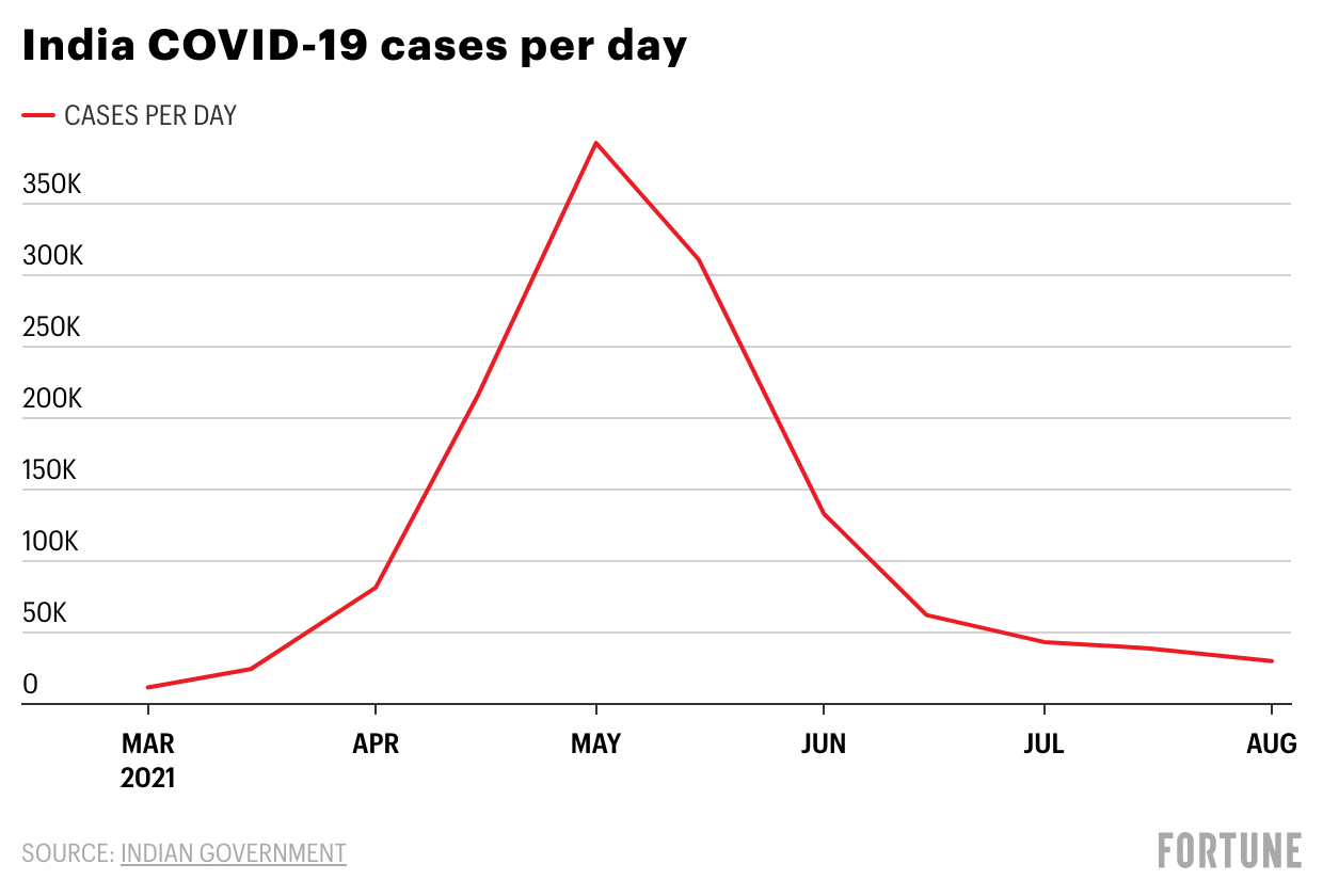 But data from other countries is providing some hope that the U.S.’ recent Delta-driven wave may dissipate as fast as it emerged. In the U.K., daily confirmed cases of COVID-19 have fallen by 50% in the past week after the country experienced its largest wave of infections in months. In India, where the Delta variant first emerged, confirmed COVID-19 infections have dropped by a factor of ten in the last few months—after peaking at nearly 400,000 daily infections in May. No one knows for certain exactly why Delta cases have dropped so fast—and many experts are baffled.