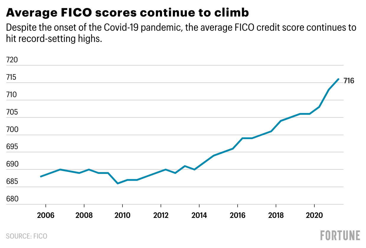 Dornhelm told Fortune the rising scores can be directly attributed to fewer missed payments, lower credit card debt levels, and changes in consumers’ behavior around credit. Just 15% of U.S. consumers had a payment that was past due by a month or more as of April. That’s down nearly 20% from the previous year. Additionally, FICO scores are not affected by certain credit issues when lenders flag that consumers are experiencing natural disasters, forbearance, or deferment.