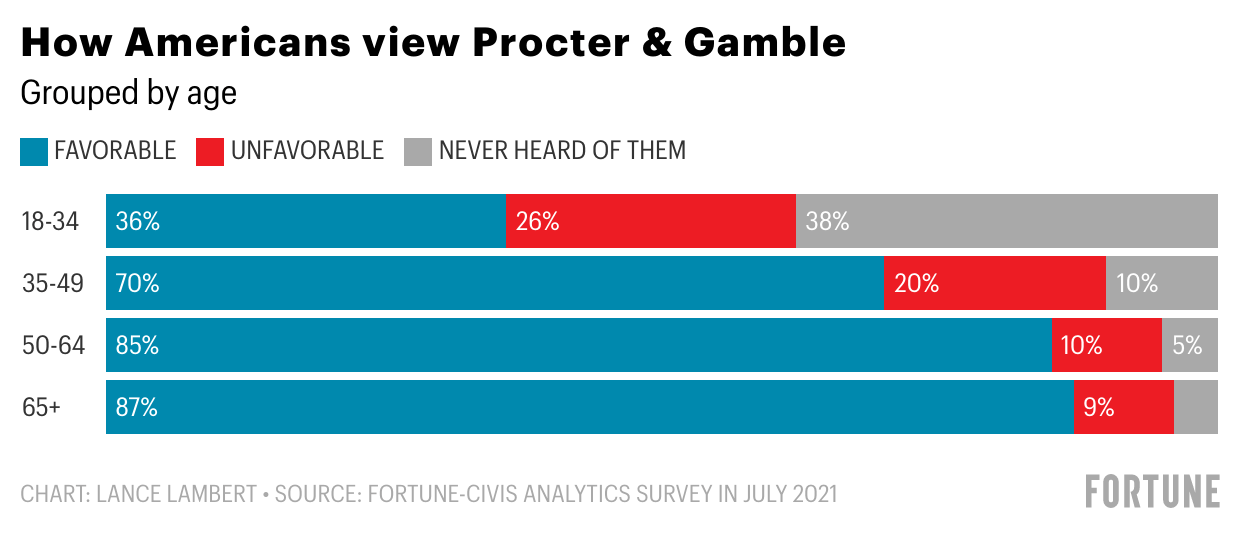 The finding? Among America’s 50 largest companies by revenue, P&G has the widest generational favorability gap. Among U.S. adults ages 18 to 34, only 36% have a favorable view of P&G. Meanwhile, 87% of Americans over 65 have a favorable view of the Cincinnati-based consumer products company.