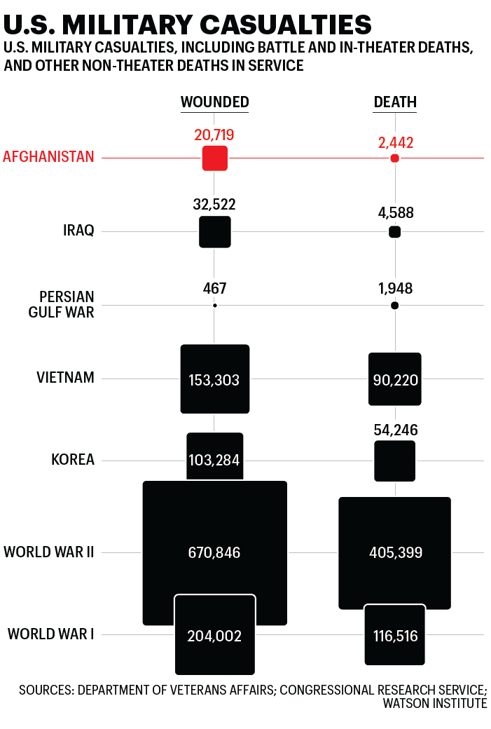 Just how much time, dollars, and lives have been spent on the “forever war”? The war in Afghanistan is the longest the U.S. has engaged in, but not by a lot. Involvement in Iraq—which also followed the 9/11 attacks—and Vietnam were similarly long and both ended in similar, confused stalemates with no winners to be declared except perhaps those who invested in defense technology.