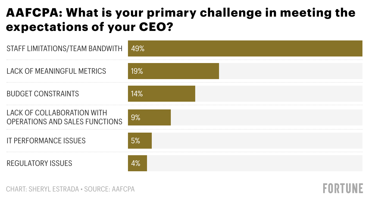 AAFCPA, a CPA and consulting firm based in New England, recently released its 2021 CFO Survey. Data analytics and management challenges faced by finance chiefs are highlighted in the report. But limitations in staffing and systems topped the list of challenges. About 49% of respondents said that staff limitations/team bandwidth is the primary obstacle to meeting CEO expectations, up from 33% in 2017. The data is based on a survey of more than 200 senior financial executives.