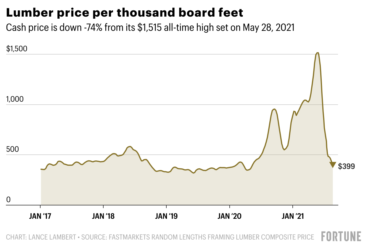 On Friday, the price of framing lumber fell to $399 per thousand board feet, according to data provided to Fortune by Fastmarkets Random Lengths, an industry trade publication. That marks the 12th consecutive week that the price of lumber is down.