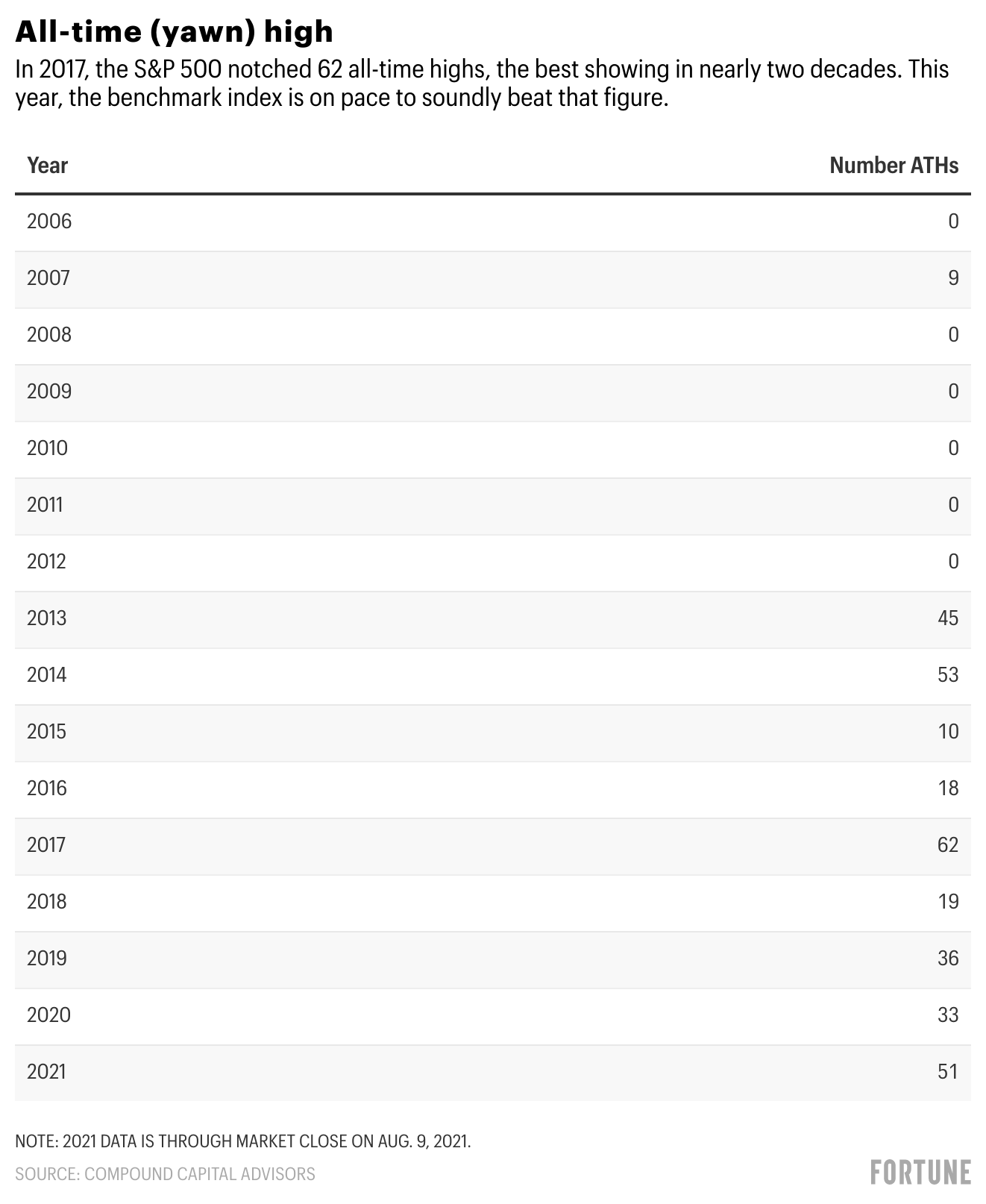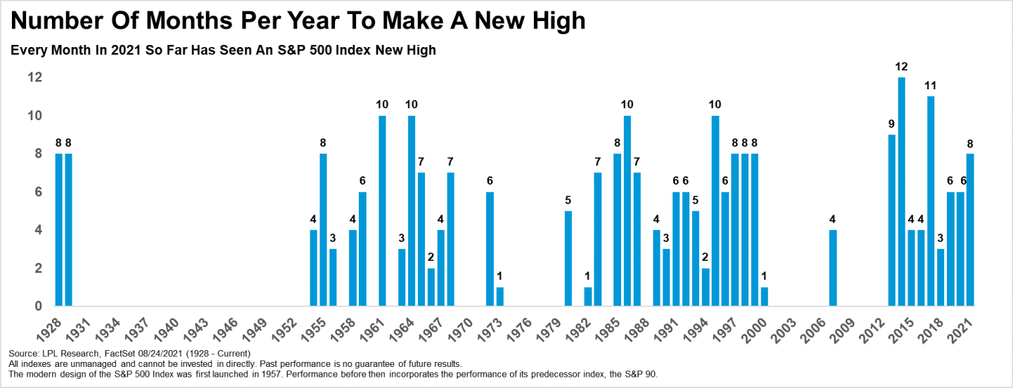 Another impressive characteristic of the S&P: it’s been remarkably consistent. It’s hit a new all-time highs each month this year. “Every month so far in 2021 has seen a new high, 8 for 8,” writes LPL Financial chief market strategist Ryan Detrick. “Only once have all 12 months made a new all-time high, and that was in 2014. This is somewhat surprising, given the S&P 500 gained only 11.4% in 2014, but it was a very slow and persistent move. Most investors (including this author) would guess it was 1995, but that spectacular year saw new highs in ‘only’ 10 months.”