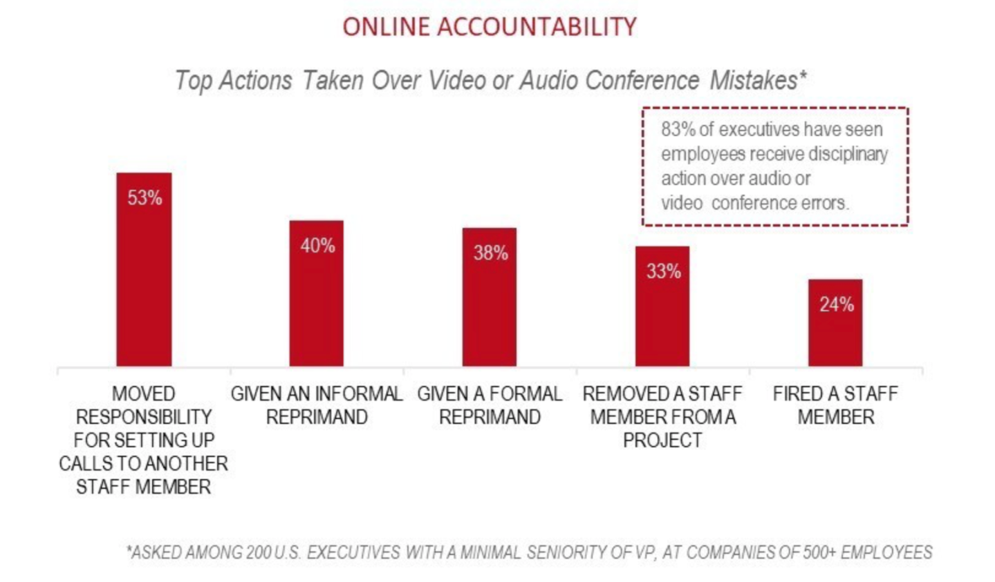 During virtual meetings, hiccups like a faulty internet connection seem to be commonplace. But some employees have paid a steep price. About 83% of executives surveyed said a staff member has received disciplinary action for an error during an audio or video conference call, according to the report. More than half (53%) said the responsibility for setting up calls was redistributed to another staff member. Meanwhile, 40% said an informal reprimand was given, 38% indicated a formal reprimand, 33% said the employee was removed from a project, and 24% said the individual was fired. Some execs said the error affected the bottom line. About 41% have missed a project deadline because of technology or connection issues, according to Wakefield Research and Vyopta.
