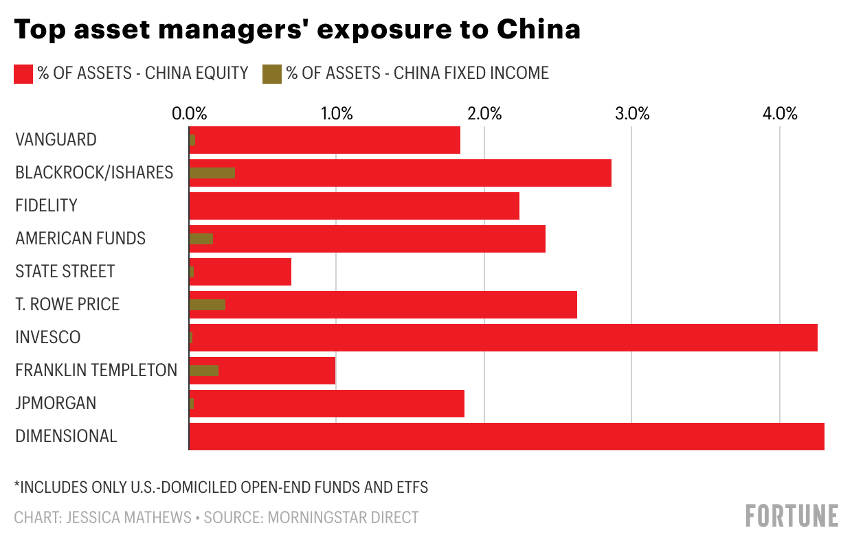 To be clear, Chinese equities and bonds are still a small portion of investor portfolios. U.S. investors are significantly more weighted in advanced markets. They tend to only have somewhere closer to 4% China exposure in their portfolios, according to Dean. At the end of June, the top 10 asset managers in the U.S. each had less than 5% of their total invested assets in open-end mutual funds and ETFs held in Chinese equity or fixed income, according to Morningstar Direct Data. State Street had less than 0.75%.