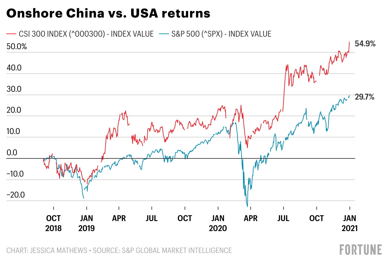 This kind of growth has been appealing to investors. Through December 2020, China’s CSI 300 Index, which tracks 300 A-share (read: domestically traded in China) stocks listed on the Shanghai or Shenzhen stock exchanges, trounced the S&P 500: