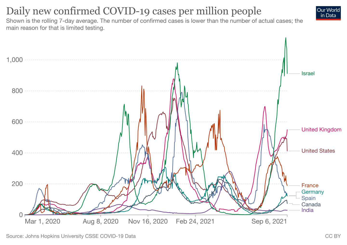 Following the spread of the Delta variant over the summer, Israel has seen cases climb, reaching an all-time high of 11,316 daily cases on Sept. 2. The number of people falling seriously sick and being hospitalized, though, has risen less than it did during the last coronavirus wave, peaking at 751 in late August, compared with 1,183 in mid-January. The trend is now downward.