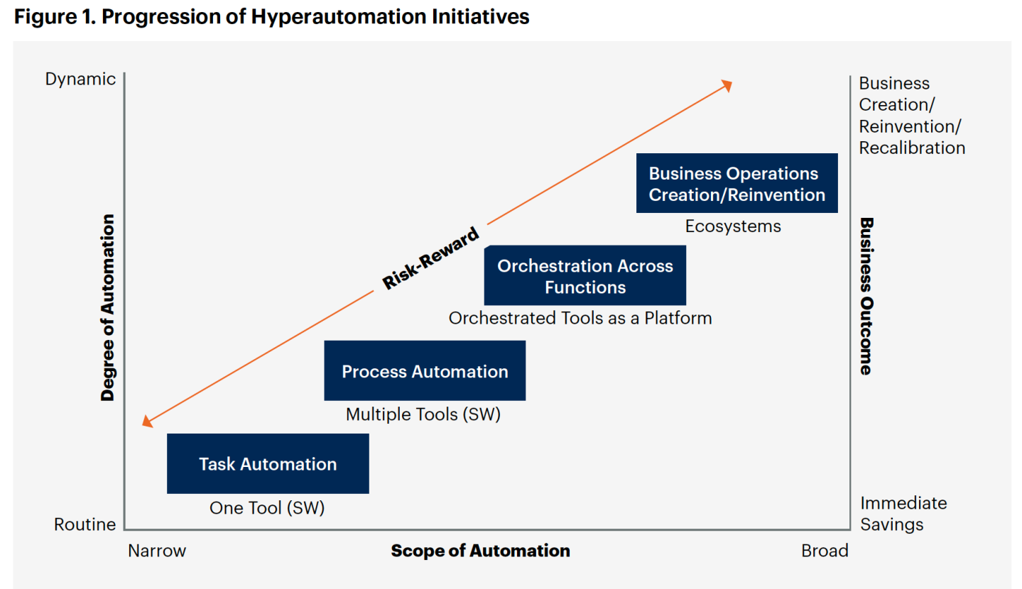 In the process of digitization, finance chiefs are “overusing a singular technology tool”—robotic process automation (RPA)—to meet efficiency goals in data management and simplify tasks, according to global research and advisory firm’s new report. So, one of the trends is referred to as hyperautomation, which is a progression of various automation initiatives rather than just sticking with one.
