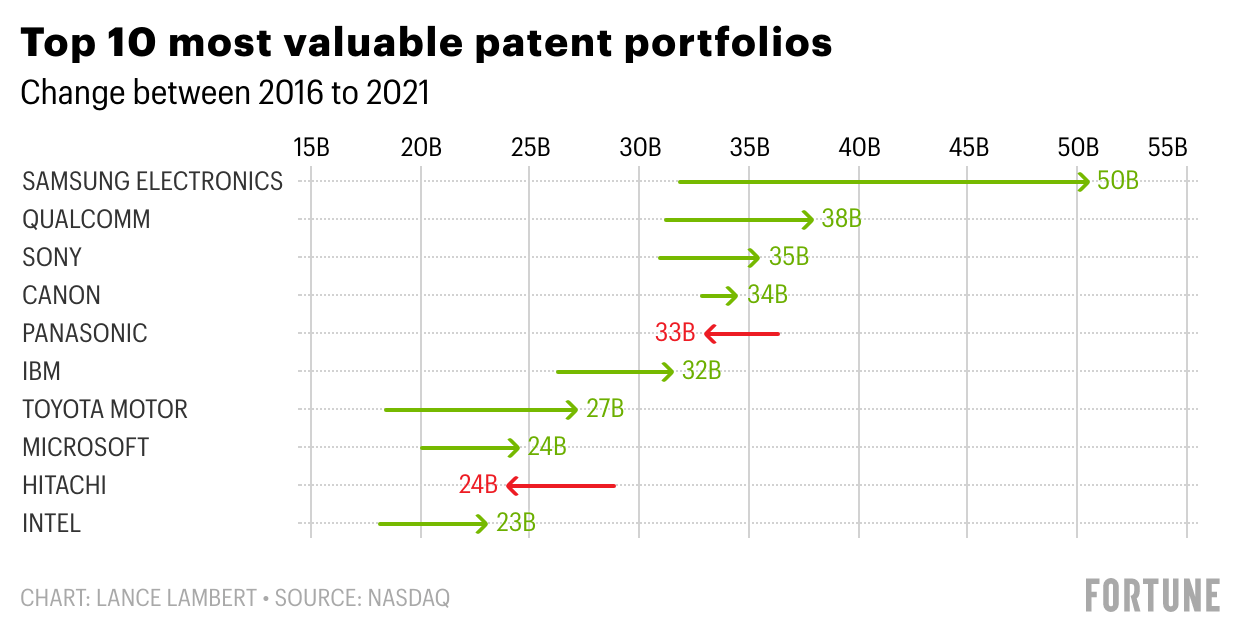 - … the total value of Samsung’s patent portfolio—the largest of any measured company in the world. It’s up 74% since 2015.