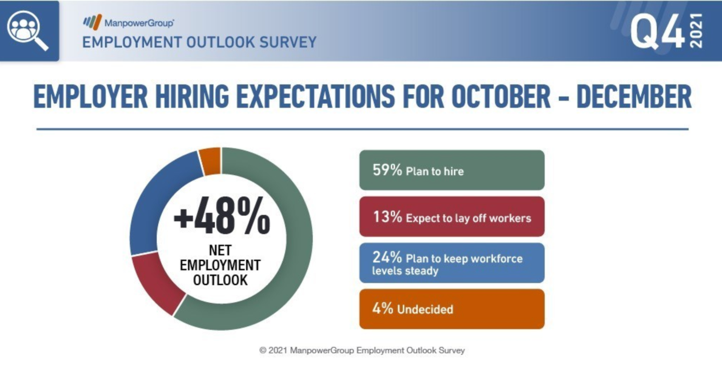 ManpowerGroup Employment Outlook Survey of more than 6,000 U.S. employers, released on September 14, found 59% plan on hiring between October and December. The extensive report also found that U.S. employers are relying on financial incentives to fill talent shortages—42% compared to a 31% global average. "This is a historic Q4 report as American employers seek to hire to meet a level of demand we haven't seen in decades that we anticipate will continue into 2022," Becky Frankiewicz, president, ManpowerGroup North America, said in a statement.