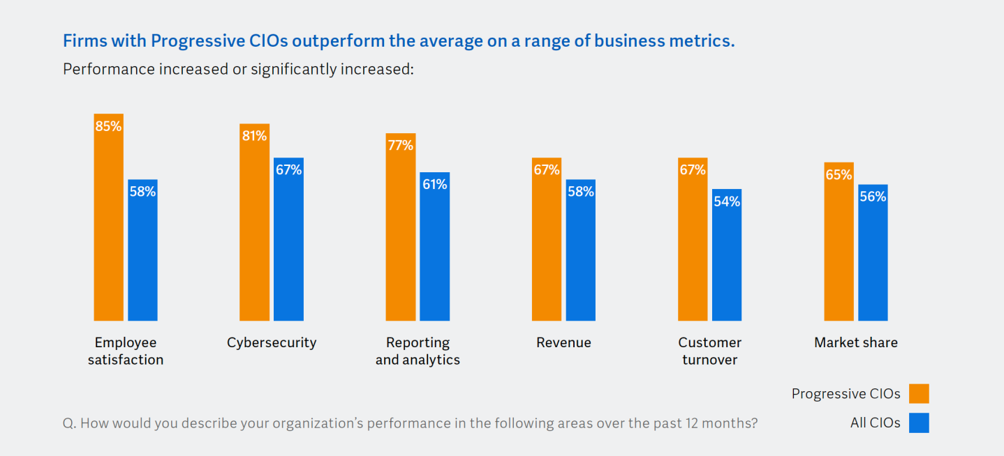 As a result, progressive CIOs have built strategic alliances across their organizations, the report found. About 90% said that their IT departments have more integration into other areas of the business, compared to 12 months ago. These tech leaders also reported increased performance across a number of key areas compared to their peers, the report found. For example, in regard to cybersecurity, 81% of progressive CIOs said performance at their company has increased or significantly increased, compared to 61% of all CIOs surveyed. And when it comes to employee satisfaction, 85% of progressive CIOs said performance is increasing compared to 58% of all CIOs.