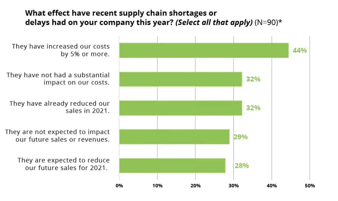 At the same time, external risks, like supply chain issues, are top of mind for CFOs. But there’s a mix of experiences. About 44% of respondents said shortages or delays increased their companies’ costs by 5% or more. And 32% said that has resulted in sales taking a dip in 2021, with 28% expecting future sales this year to suffer. However, 32% of CFOs said supply chain issues haven’t had a profound impact on their costs, and 29% don’t expect future sales or revenue to be affected this year.