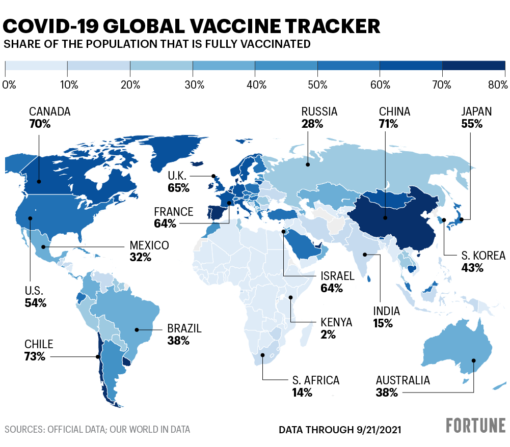 That’s a yet another reminder that while the U.S., now mulling booster shots, may have reached something of a (lackluster) saturation point—with 54% of its population fully vaccinated—many nations are still in the very early stages of vaccinating against COVID.