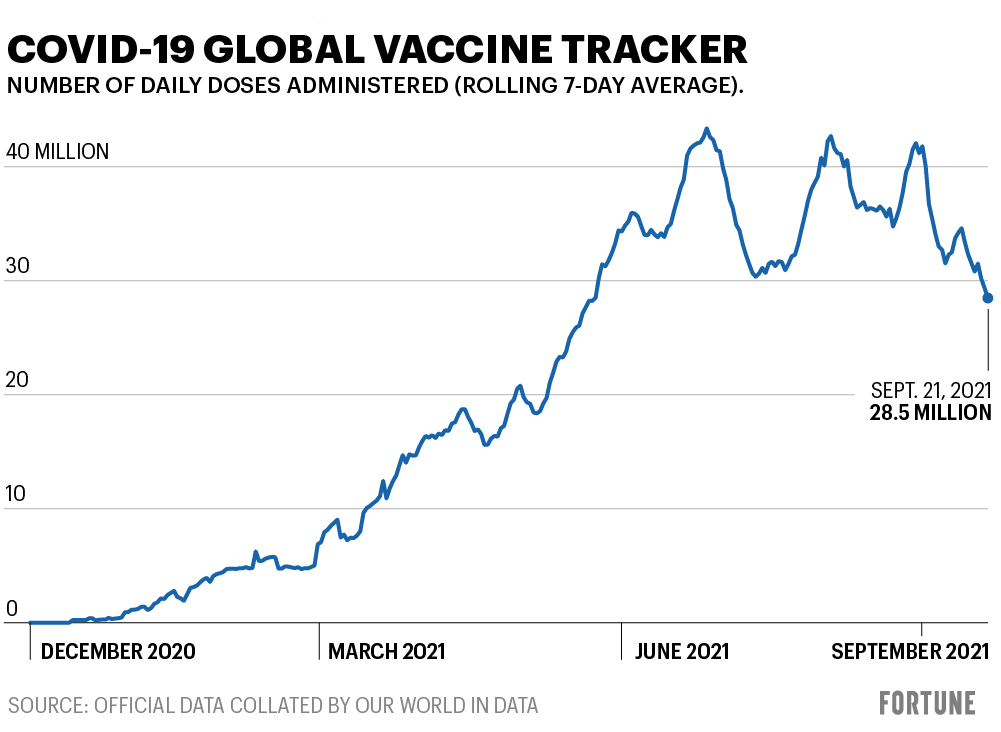 According to Our World in Data, which gathers information from local governments, 43.7% of the global population has gotten at least one COVID shot as of Sept. 22. For those living in low-income countries, the rate is just 2%. Around the world, 28.48 million vaccines are being distributed each day, down from the June 2021 peak of more than 40 million per day.