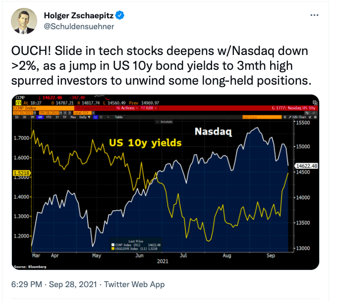 That's the one-month performance for NYSE FANG+, a bellwether big-cap tech ETF. It includes FAANG-stock bluechips, plus the likes of Nvidia, Tesla and Alibaba. It's fallen as bond yields have taken off.