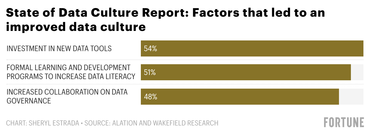 The recent State of Data Culture Report, sponsored by Alation, a software company, and executed by Wakefield Research, explores why data-driven decisions can lead to process optimization. Many data and analytics leaders said they could use more support in implementing new processes. About 74% surveyed claim their CFO’s do not invest enough in data and analytics. And 89% of companies that fell short of targeted revenue goals point to their CFO not investing enough, according to the report. Companies with a "top-tier data culture" are most aware of the risk of disruption from competitors who are able to use data better, the research found. More than half (54%) of respondents said factors that led to an improved data culture include investment in new data tools. The report is based on a study of 300 data and analytics leaders at companies with more than 2,500 employees in the U.S., U.K., Germany, Denmark, Sweden, and Norway.