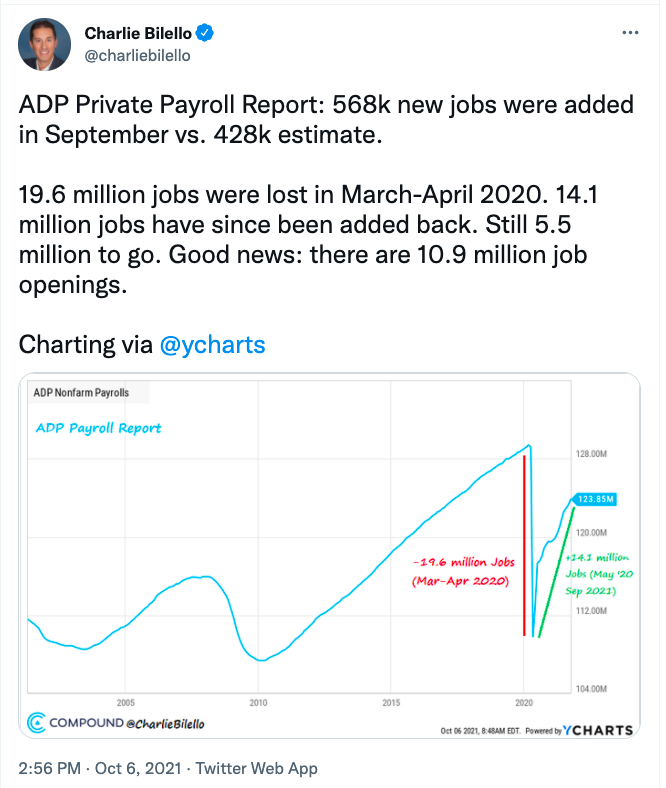 - We have the big jobs report tomorrow, which is why yesterday’s ADP payrolls data was such welcome news. ADP says private jobs rose by 568,000 in September, well above economists’ estimates.