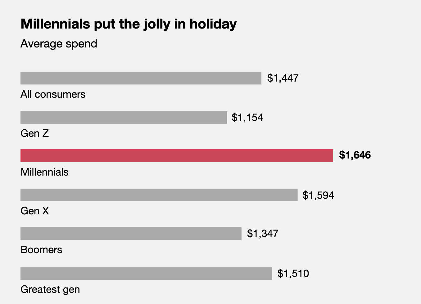 This year, consumers will spend an average of $1,447 on gifts, entertainment, and travel, according to PwC's 2021 holiday consumer survey. This is up more than 20% over last year. However, millennials (ages 26-39) will spend the most this holiday season compared to other age groups, with an average budget of $1,646, the firm found.