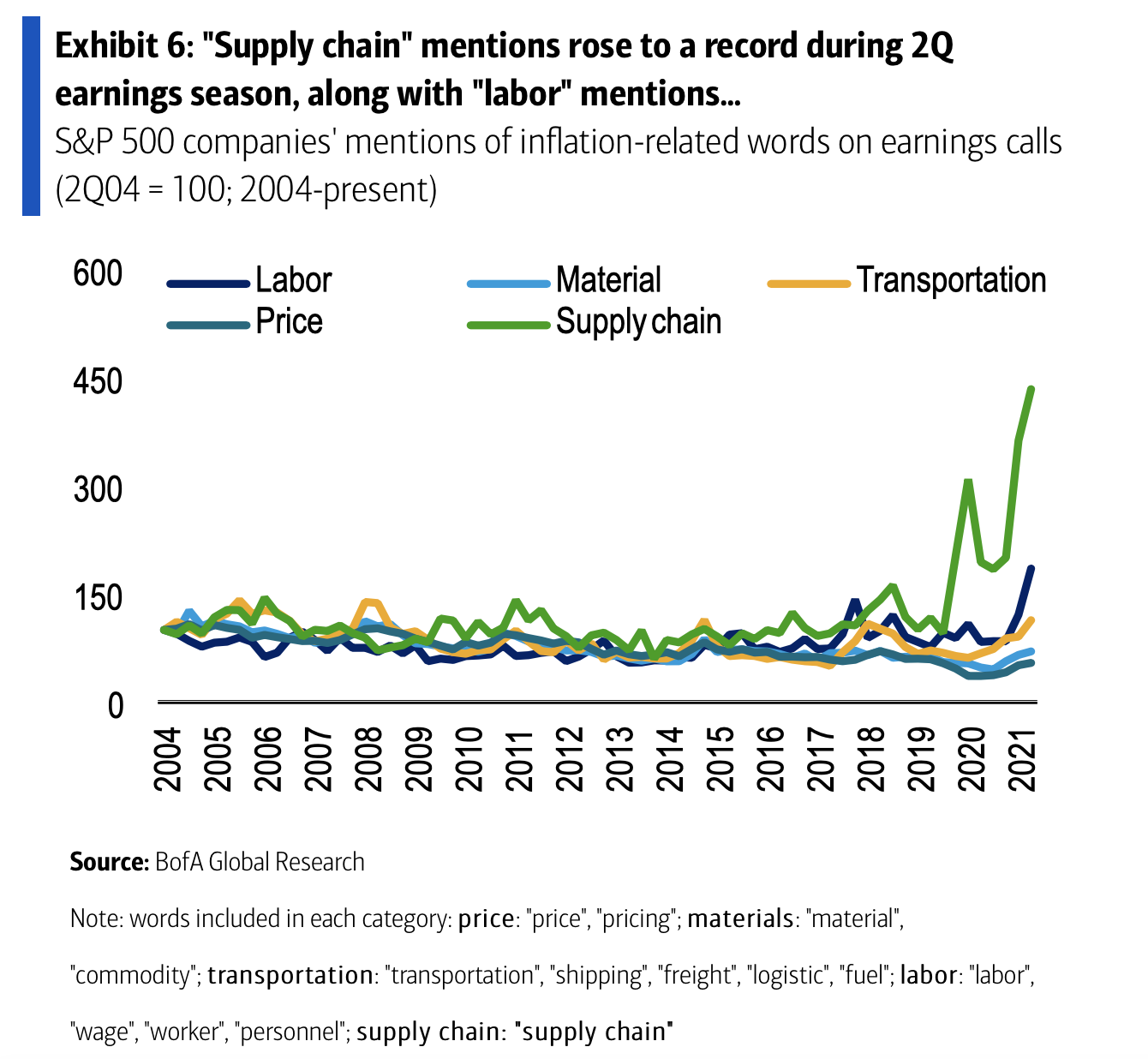 Take supply chains. CFOs grumbled about supply supply chain disruptions so often last quarter that had you challenged your pal to a drinking game—chug a root beer every time the words are mentioned in an analyst call—you’d be really sick of root beer right now. Thank goodness you didn’t do anything that foolish. Just look at how many supply chain mentions (labor, too) there were last quarter, according to this BofA tally. Hundreds!