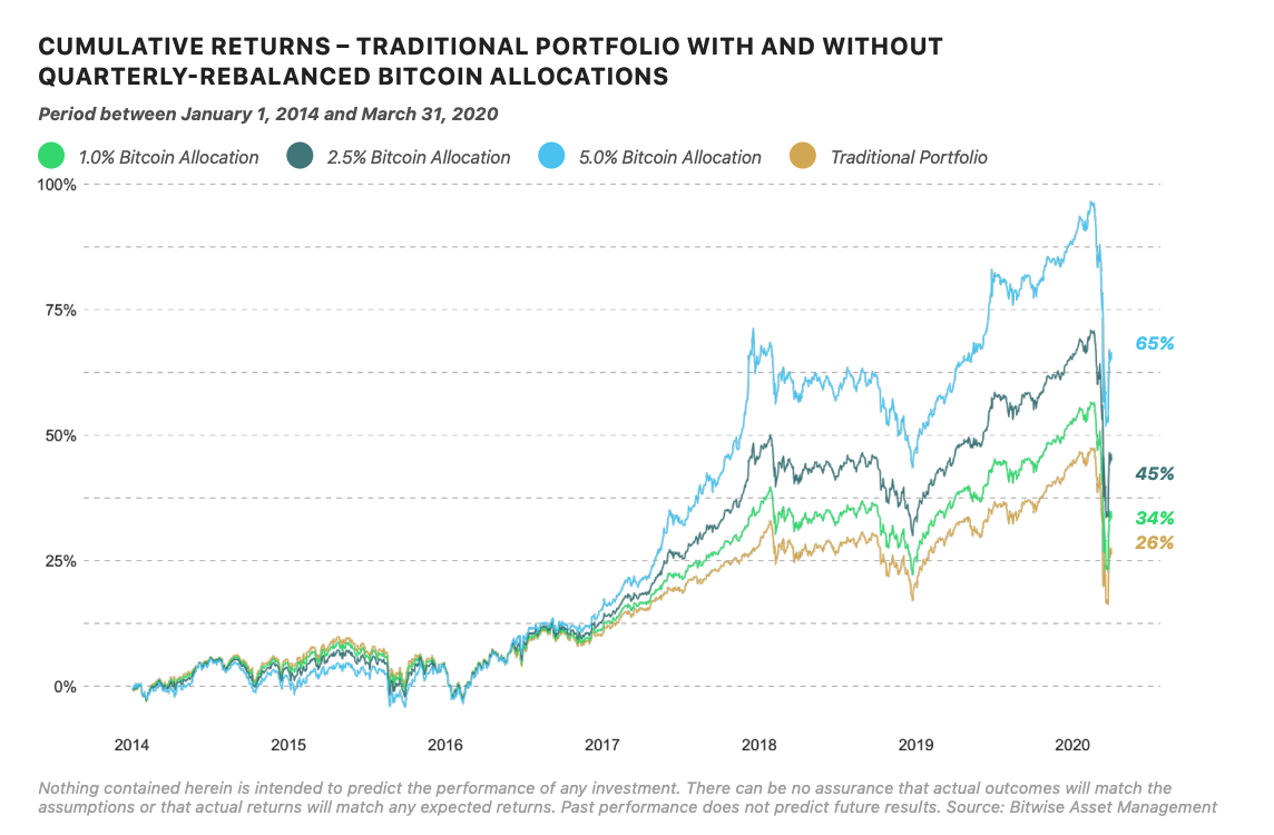 Portfolios that allocated 2.5% of their assets into Bitcoin would have improved their returns by 18.7 percentage points between Jan. 2014 and March 2020, according to research from Bitwise that evaluated 60/40 portfolios (meaning that they invest 60% of assets in equities and 40% in bonds). A 5% Bitcoin allocation would have doubled returns. Just a disclosure here: Bitwise has funds that offer exposure to cryptocurrency.