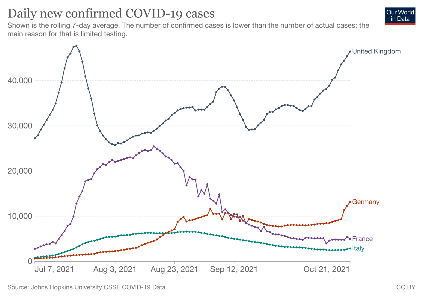 This more lax style has inevitably led to more cases, U.K. officials lament. According to Public Health England, the 52,000 new infections reported yesterday put Britain far above the rest of Europe.
