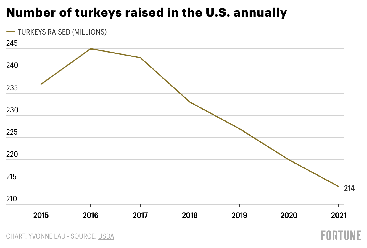Production in the U.S. this year slipped to 214 million turkeys raised, a 3% decline from last year’s 220 million, says the U.S. Department of Agriculture. The volume of turkey meat produced in the U.K. dropped 9.3% in the year ended in September, compared with one year ago, according to U.K. government statistics.