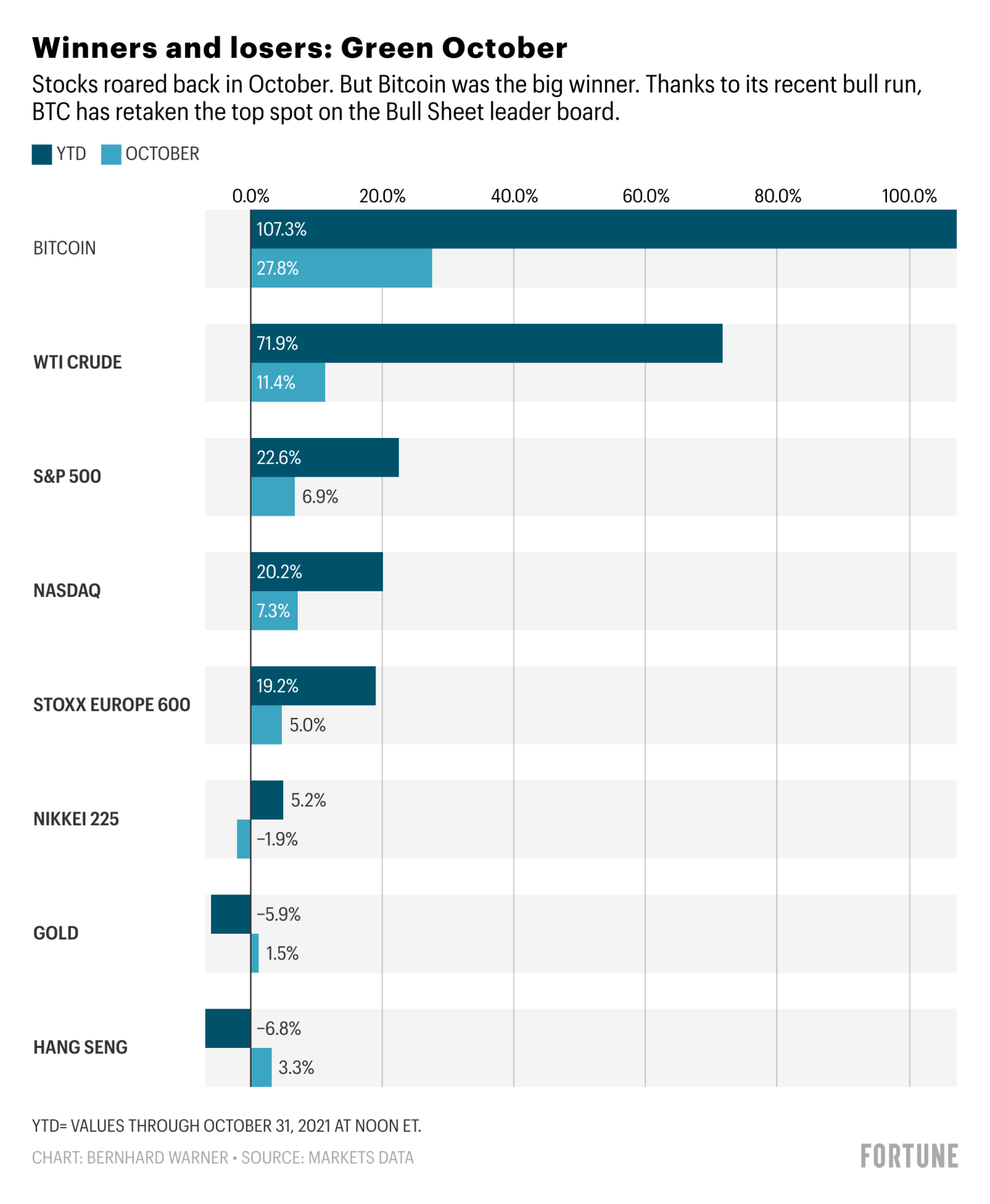 Let’s start at the top. Crypto and crude have been swapping the top spot in the Bull Sheet leaderboard all year. Bitcoin soared nearly 28% last month. Year-to-date, it’s more than doubled. That strong October performance was enough to push oil to the No. 2 spot. The U.S. benchmark West Texas Intermediate (WTI) is up nearly 72% so far in 2021 after gaining a further 11% last month.