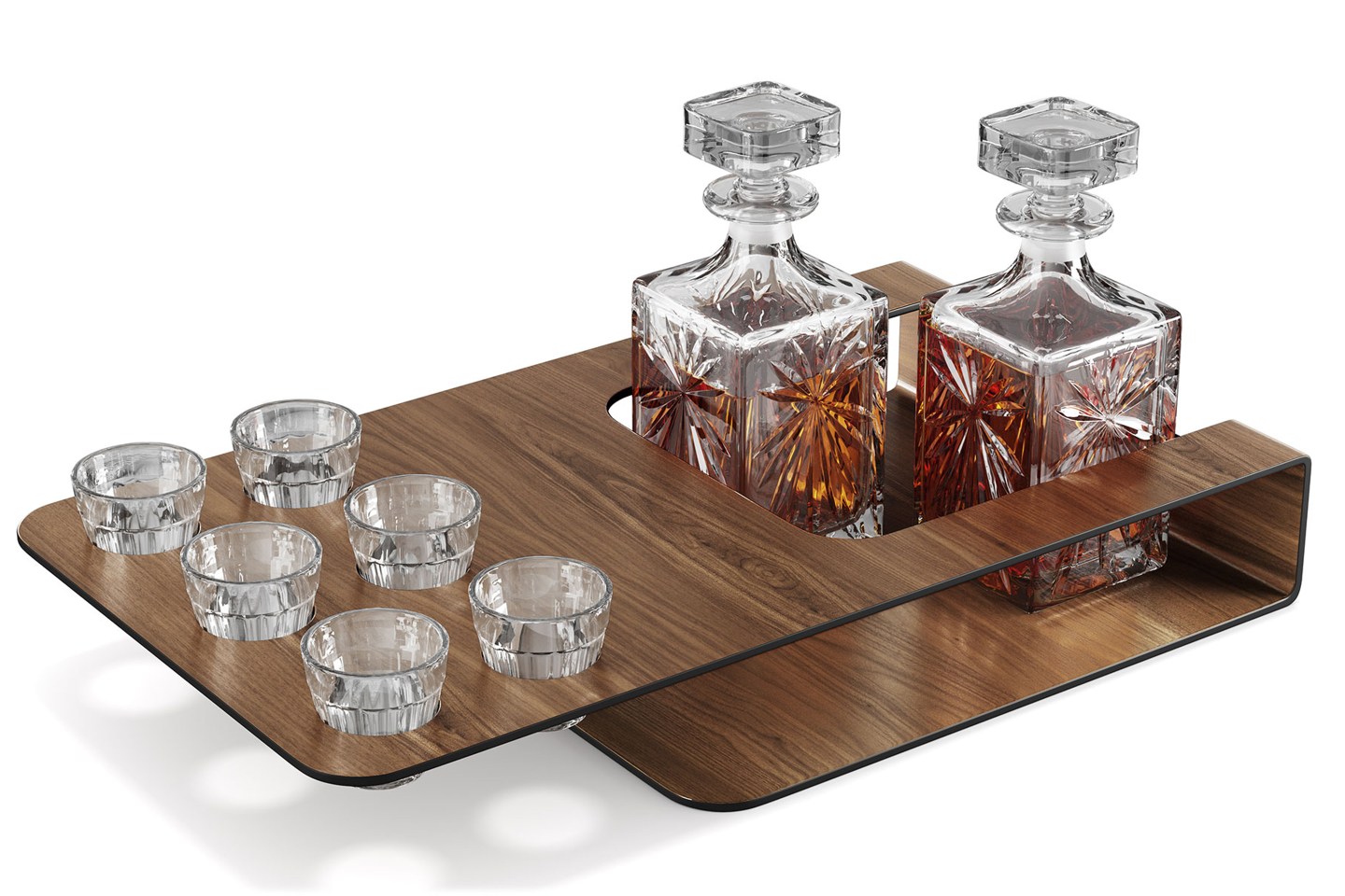 Statement-making furniture brand Modloft crafted a sleek spirits server, designed to fit on any bar top. With a mid-century-inspired aesthetic, this server holds spirits decanters and six rocks glasses. It’s a lot of crystal in one place, which is why this server excels at its function too. It’s laser-cut stainless steel with a walnut wood veneer, plus a solid brass base to hold it securely in place. SRP: $795