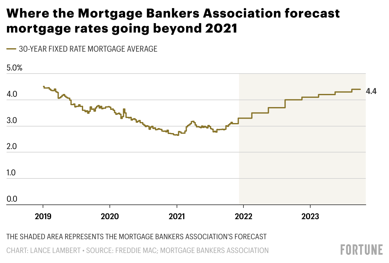 Fannie Mae foresees the average 30-year rate climbing to 3.4% by the end of next year. Meanwhile, the Mortgage Bankers Association is forecasting that the mortgage rate will climb to 4% by the end of 2022, and to 4.4% by the end of 2023.