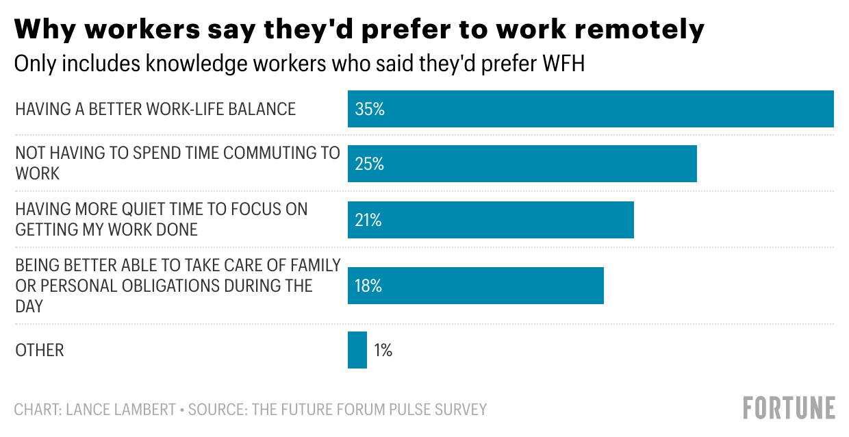 The most common answer is having a better work/life balance (35%), followed by not having to commute (25%), and getting more quiet time (21%). Another 18% cite getting more time to care for their family/personal obligations.