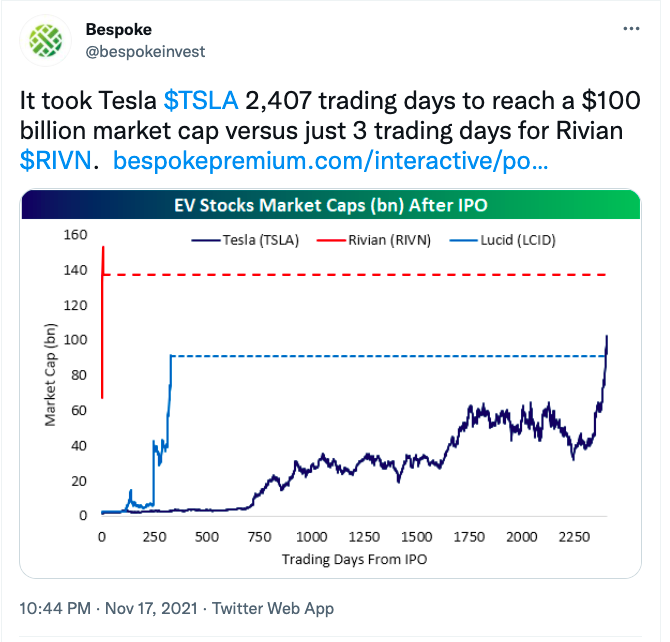 I had a bunch of Rivian-related Tweets ready to go yesterday afternoon, and then the stock sank more than 15%. Still, its market cap is above $100 billion and revenues are more or less $0.