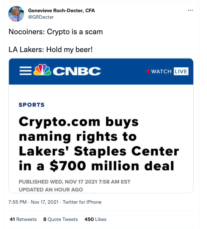 The Staples Center, home to the NBA’s Los Angeles Lakers, has a new name: the Crypto.com Arena. The name-change did nada for crypto prices, however.