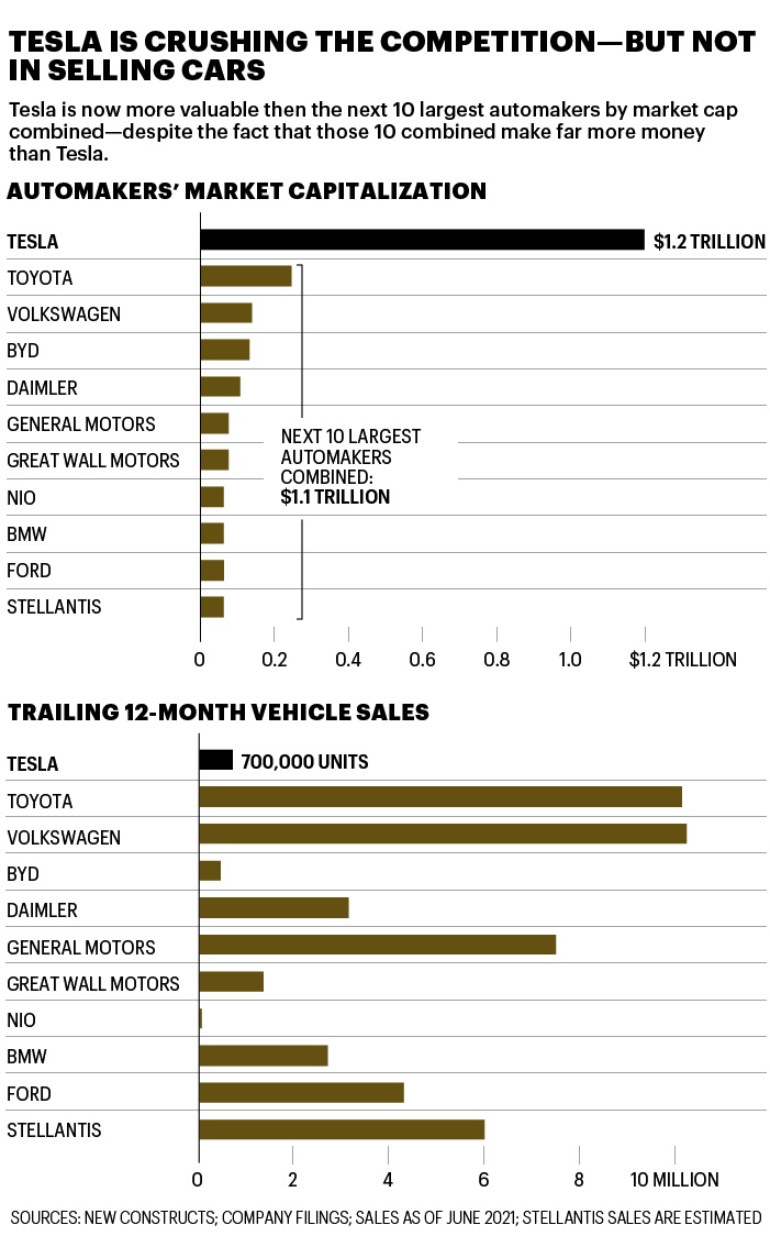In essence, the market is saying that Tesla’s competitors won’t be able to make EVs profitable, even as they pour billions of dollars into the electric transition. “The market’s become highly segmented in the eyes of investors,” says Stewart. “They think it will be winner-take-all for Tesla, and the other companies will be me-toos and hangers-on. They’ll be battling over the commodity end of the market, while Tesla cleans up as the top brand and technology leader.”