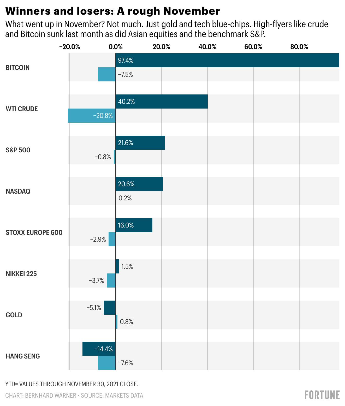 - There’s a bounce-back in Asia. The Hang Seng, a November laggard, closed up 0.8%.