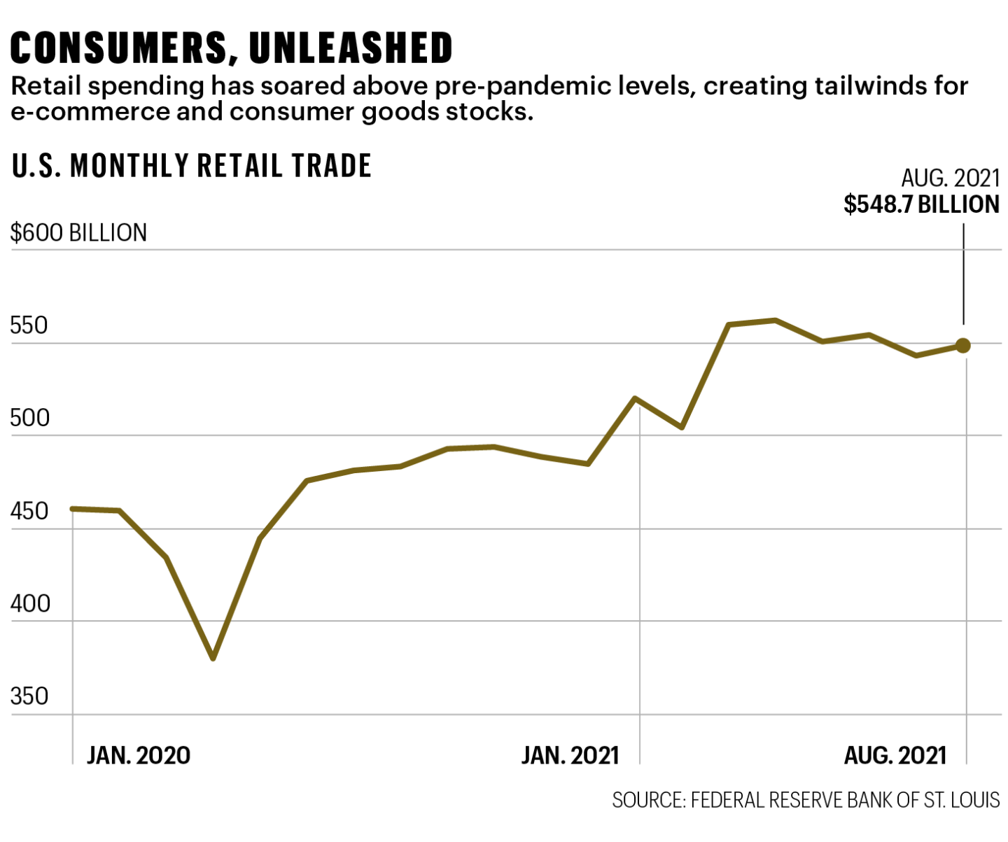 Canada-based Shopify is becoming a formidable player in the global e-commerce space and a winner for investors, with its share price up over 420% since mid-March 2020. Despite the run-up, Gary Robinson, a portfolio manager at asset manager Baillie Gifford’s U.S. Equity Growth Fund, is bullish on Shopify’s long-term story. “The size of Shopify’s business has been completely transformed through the pandemic,” he says. Though Shopify missed Street estimates in its most recent earnings, analysts wager it can continue to grow sales by nearly 34% next year. The company is “starting to become the partner of choice when other platforms are looking to integrate e-commerce,” says Robinson, citing Shopify’s partnerships with heavy hitters like Walmart, Instagram and Facebook shops, and TikTok. As with PayPal, part of Shopify’s revenue comes from fees based on a percentage of the value of goods sold. If inflation keeps ticking up, Robinson argues, “Shopify revenues are going to march up with the rise in prices.” You’ll pay a pretty penny for that growth and inflation protection: The stock trades at over 260 times forward earnings.